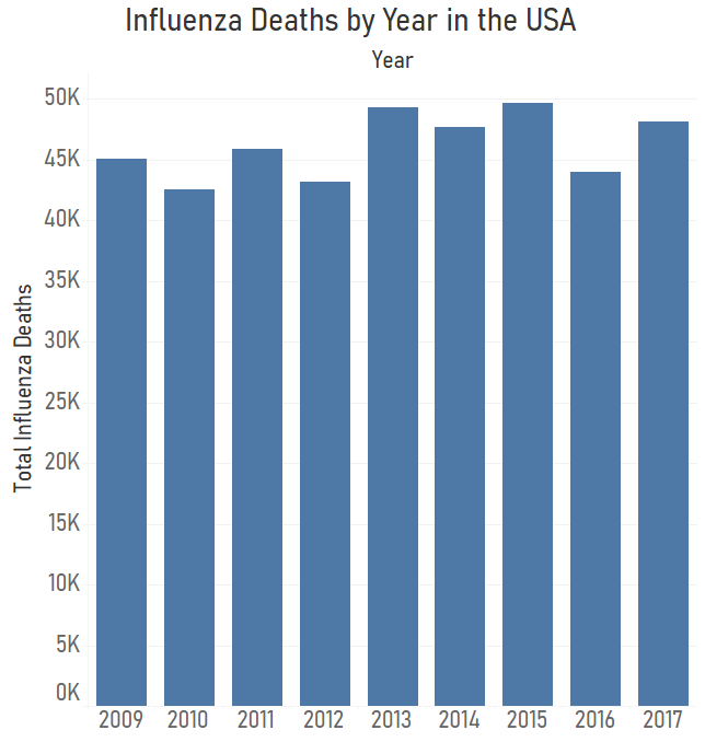 First, I looked at the total deaths due to influenza by year in the USA from 2009-2017 to see how many additional patients medical staff would be needed for. The total deaths due to influenza are between 40,000 and 50,000 every year.