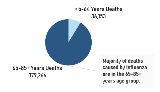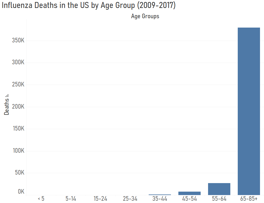 I divided the deaths due to influenza by age group and found that the greatest number of deaths occur in the 65-85+ years age group. This age group is the most vulnerable age group.
