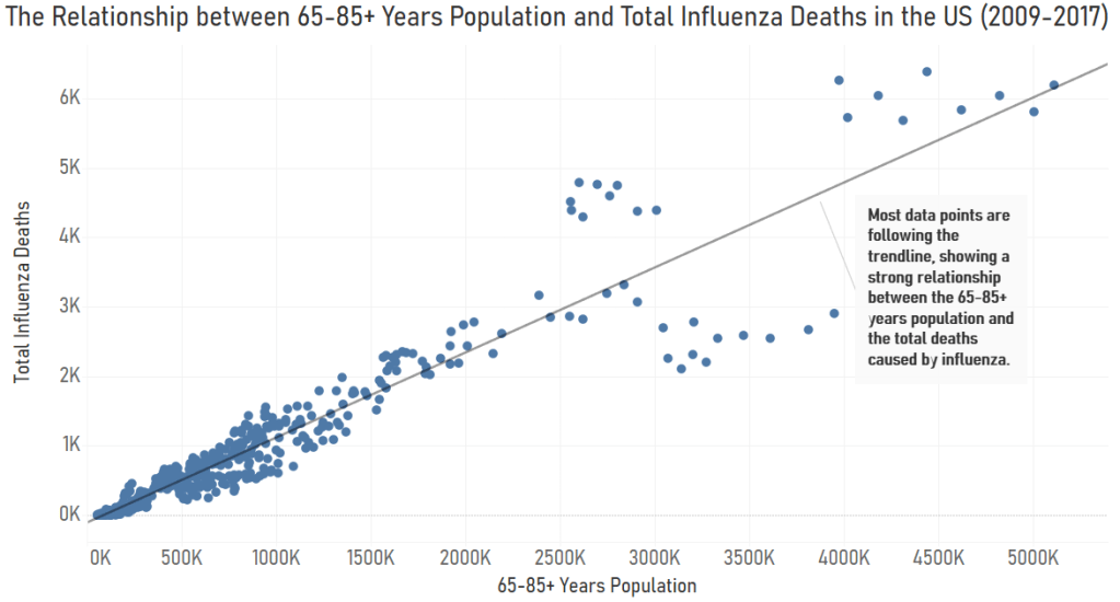 - States with larger populations of people in the 65-85+ age group have higher mortality numbers due to influenza.