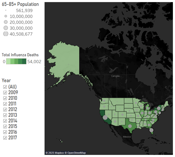 For each US state, I looked at the population of people ages 65-85+ and total influenza death counts on a geographical plot to identify which states will require more medical staff to treat influenza patients. The states with the largest populations of people ages 65-85+ and most influenza deaths are California, New York, Texas, Pennsylvania, and Florida.