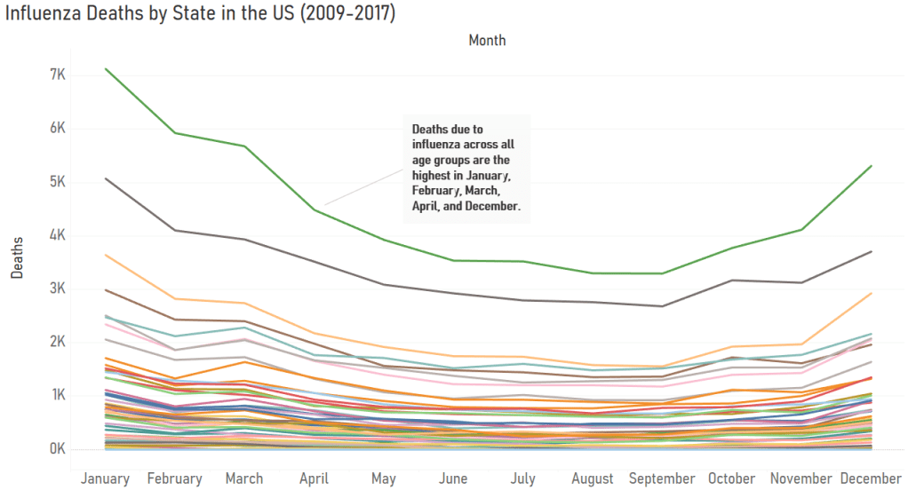 To determine whether influenza occurs seasonally or throughout the year, I analyzed the influenza death counts in each state by month of the year on a line chart. This led to the discovery that influenza occurs seasonally and results in the most hospitalizations and deaths in January-April and December. This seasonality of influenza is the same every year.